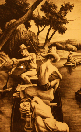 This is a scene on the White River in the Ozarks. Drawings from this lithograph were made while ona float trip. The area presented is now under 75 feet of water, due to the construction of Bull Shoals Dam. However, such scenes are still common on the clear Ozark rivers which remain free flowing. The boy in the picture is Benton’s son, T.P.