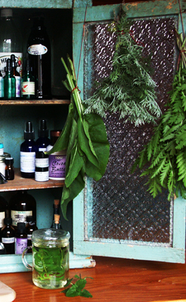 Hanging from the door (from left) comfrey (Symphytum officinale L.), wormwood (Artemisa sp.), and tansy (Tanacetum vulgare). Lemon balm (Melissa officinalis) is in the glass cup on the counter.