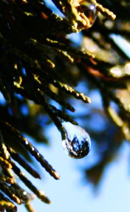 “The world reflected in a drop of water. Red Cedar (Juniperus virginiana), StateoftheOzarks Archive, February 3, 2006.