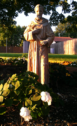 A statue of St. Francis in a bed of impatiens. The connection between spiritual healing and garden plants has a long European history. Photo courtesy of Jenney Head, Ozark Roots & Conjure.