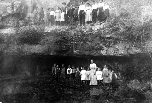 Two of the holler’s rock shelters later served as a brush-arbor-style church yard from 1880 to 1930. A two-story stone outcropping known as Preacher’s Rock was chosen as the pulpit. The shelter below the rock served as a choir “loft.” The congregation sat in the opposing shelter. Bluff Church, it was called.