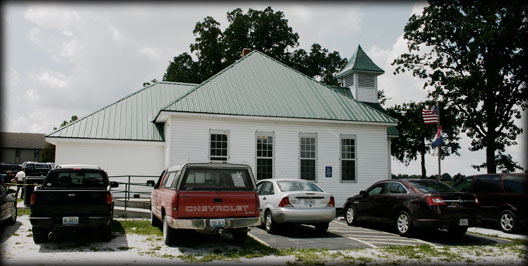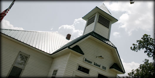 | The north side of the restored Bruner School, now with brand-new roofing and even a handicap entrance, is home to regular social functions, a weekly jam session, as well as a community polling place. This parking area is the location of the first Bruner School, constructed in the late 1800s. | ||||||||||||||||||||||||||||