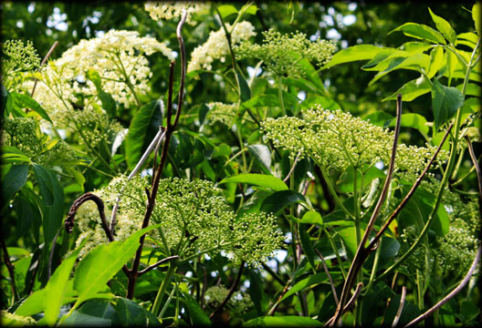 | PLATE 3, Elderberry fruit detail American Elder / Elderberry (Sambucus canadensis) Stands of American Elderberry are easy to spot in the roadsides and around abandoned farmsteads not only int he Ozarks but throughout much of North America. Deciduous and all-but invasive, the American Elderberry shoots up easily with quick-growing, pithy sprouts reaching three to 10 feet in height. In spring, clusters of creamy white blossoms appear the blossoms themselves may be battered, fried and dusted in cinnamon and sugar. By late summer the groves of elderberry are heavy with purple-black berries, glistening in the hot summer sun. These berries dark and staining have been gathered for generations for wine, jelly, cordial, even dye for yarns. European and hillbilly traditions even point to mystical powers of the humble elder. A living bit of history in our own backyards and roadsides. The American Elderberry touches Ozarks culture from time immemorial. Time to go berry picking! Joshua Heston, editor September 3, 2012 _______ Elderberry (Sambucus canadensis) Size: 3 to 10 feet tall; leaves 4 to 9 inches long. What to look for:leaves compound, usually with 7 elliptical, sharply toothed leaflets; flowers creamy white, in broad clusters; fruits berrylike, purple-black; twigs pithy, white inside. Habitat: swamp edges; along fences and roads. page 330, Wernett, Susan J., et al. North American Wildlife. The Reader's Digest Association, Inc., 1986. _______ From Vance Randolph... A great many of the old-timers call December 25 New Christmas, in order to distinguish it from Old Christmas which falls on January 6. They tell me that in pioneer days nearly everybody celebrated Christmas twelve days later than they do now. Old folks say that elderberry always sprouts on the eve of Old Christmas even if they ground is frozen hard, youll find the little green shoots under the snow. page 77, Ozark Superstitions by Vance Randolph, Columbia University Press 1947 Another funny thing, says Mr. Short, is that if you go out before midnight on New Years Eve and cut an elderbush off flush with the ground, by sunrise it will have pooched up at least two inches. page 20, Ozark Superstitions by Vance Randolph, Columbia University Press 1947 |