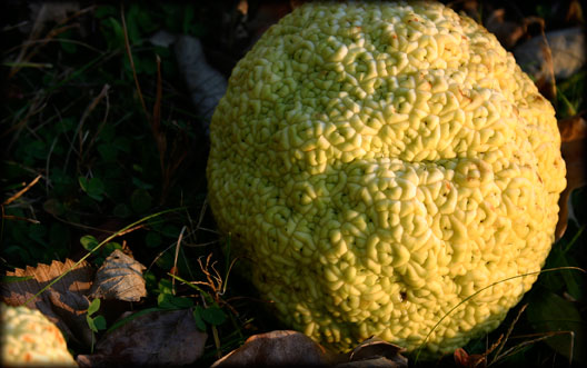 | The Osage-orange A true North American bois darc, the Maclura pomifera was relied upon by the Osage tribe, hence its common name, the Osage-orange. Many native peoples used the Osage-orange for bows, much as the English used the European yew. The strength and resilience of this trees wood is astounding, as is the tree's rather prickly disposition. The thorns (plate 3) at left, are sharp and numerous. The fruit, which does resemble an orange (plate 1), is inedible to humans and indigestible to horses. Only squirrels, it seem, rely on the fruit, digging apart the hedge apples during the winter months in order to get at the seeds. Cultivated at the turn of the 19th century across North America as a hedge and windbreak, the trees may still be found along original plat lines at least where large-scale farming hasn't uprooted them to make room for a few more rows of corn. The Osage-oranges wood itself is extraordinarily long-lasting. Many a hundred-year-old fence post may still be found, weathered but strong as ever (plate 4), a silent testament to our rural past. The Osage-orange is in the Moraceae Family, as is the Mulberry. One may find similarities in leaf and fruit structure. All species are late to leaf out in the spring and rarely appear ready for winter. A killing frost is usually the only thing to get these trees to drop their leaves. by Joshua Heston November 8, 2008 Hedge Tree or Hedge Apple (Maclura pomifera) Size: 30-40 feet tall; leaves 3-5 inches long. What to look for: leaves broadly lance-shaped, shiny dark green above; stout spines on twigs; fruit yellow-green, nubbly; bark furrowed, shreddy. Habitat: rich bottomlands; planted in hedgerows and shelterbelts. page 301, Wernett, Susan J., et al. North American Wildlife. The Readers Digest Association, Inc., 1986. |